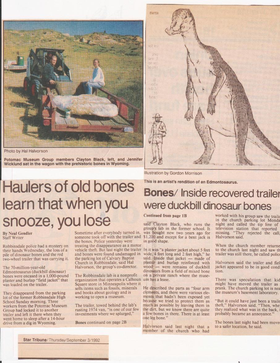 Now we were really pissed! Based on the lackadaisical police response, Wendy – a long-time lab and field tech – devised a great idea. She suggested we embrace the novelty of the situation and notify the media. Since this sort of robbery is not an everyday occurrence – at least not in Minneapolis! – it might be worth a story. That proved genius – not two hours later the Lab was swarming with TV, radio, and newspaper reporters. It became headline news: Dinosaur Bones Stolen From Local Geology Lab!